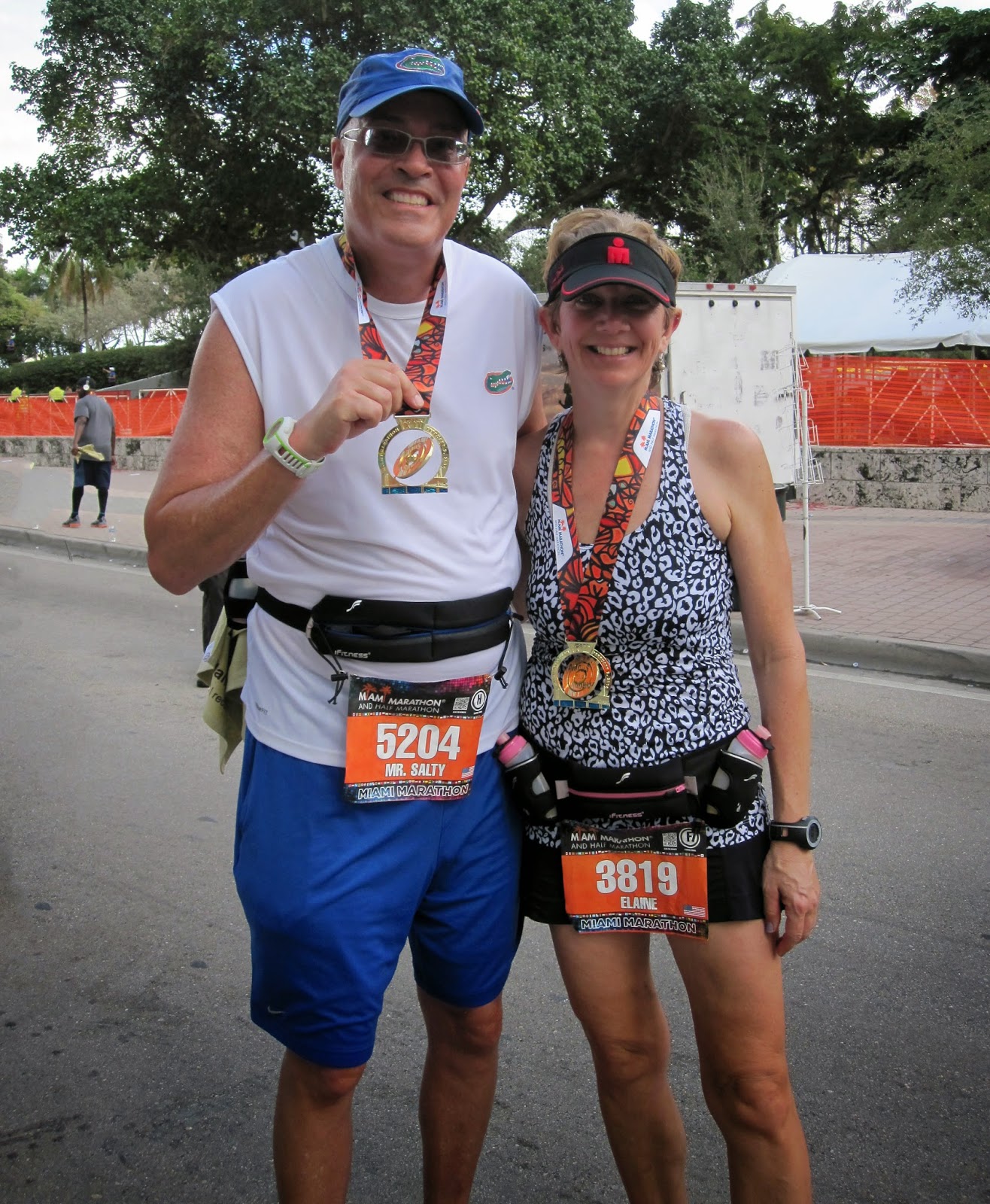 As we hit mile marker 21, we were told by a race official to “get on the sidewalk or get on the bus,” as they were about to open up the roads to local traffic. This seemed very curious to us, as we had more than an hour before they were supposed to open the streets. At mile marker 22, the course had us running up and back on the Rickenbacker Causeway for 2 miles. When we got there, we were told that the road was closed to the runners and we should just continue to go north on Biscayne Blvd. We were assured that we would still receive a finisher’s medal for the race. When Elaine asked me what he meant by that, I told her that we were only going to run 24.2 miles; not a full marathon. If you know anything at all about me (or Elaine), you know there is no way we would take the medal unless we ran the full race. Still perplexed as to why we were cut off so early in the race, we decided to deviate from the course in order to make up the two miles we had lost by not running on the Rickenbacker Causeway. Imagine the looks we received when the runners behind us wondered why we were running in the wrong direction. In the end, we made up the mileage and crossed the finish line with our watches reading 26.2 miles. We spoke with race officials later on, and they seemed just as mystified as to why this happened as we were. They are supposed to get back to me, but I’m not holding my breath.